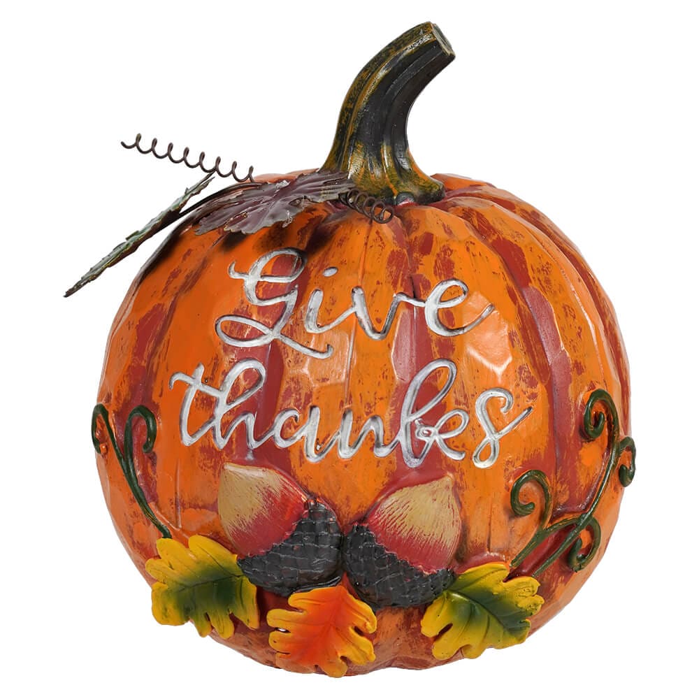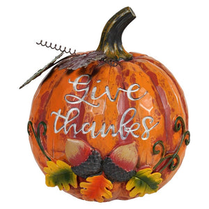 Celebrate the spirit of gratitude with the Give Thanks Resin Harvest Pumpkin. This round resin pumpkin is adorned with captivating fall elements such as colorful leaves and acorns. On its face, it features the heartfelt message "Give Thanks" in elegant white cursive letters, adding a touch of warmth and appreciation to any setting.
