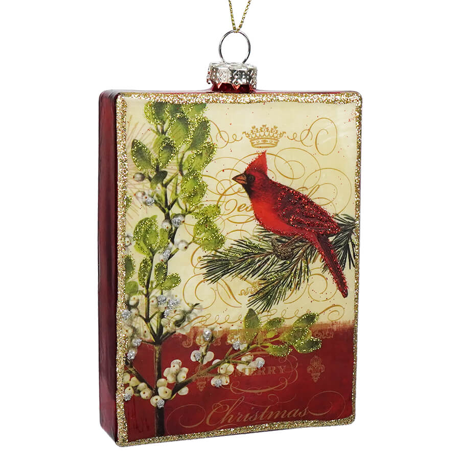 Glass Glittered Cardinal On Branch Rectangular Ornament