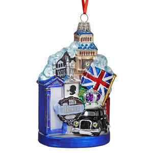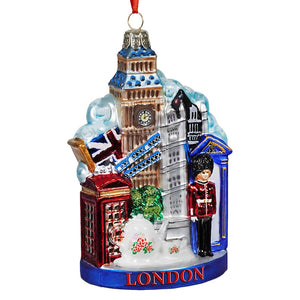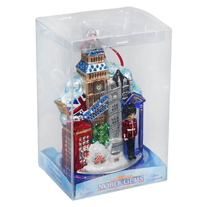 With a stature of 5.75 inches, this glass tree ornament encapsulates the vibrant essence of London's most iconic features. Every inch of its design exudes the festive joy of the city's celebrated landmarks. The bold blue base is reminiscent of the River Thames while the shimmering accents mimic a gentle snowfall, adding a wintry gloss to the scene.