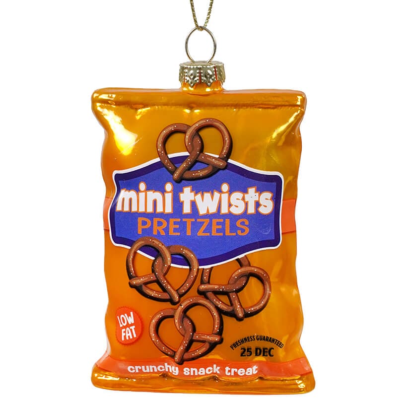This ornament replicates a classic bag of mini twist pretzels, wrapped in an eye-catching orange package with a bold blue label that contrasts beautifully with your tree's natural hues. The glasswork is precise, giving the illusion of a bag filled to the brim with those beloved, knotted treats, each twist inviting a bite.