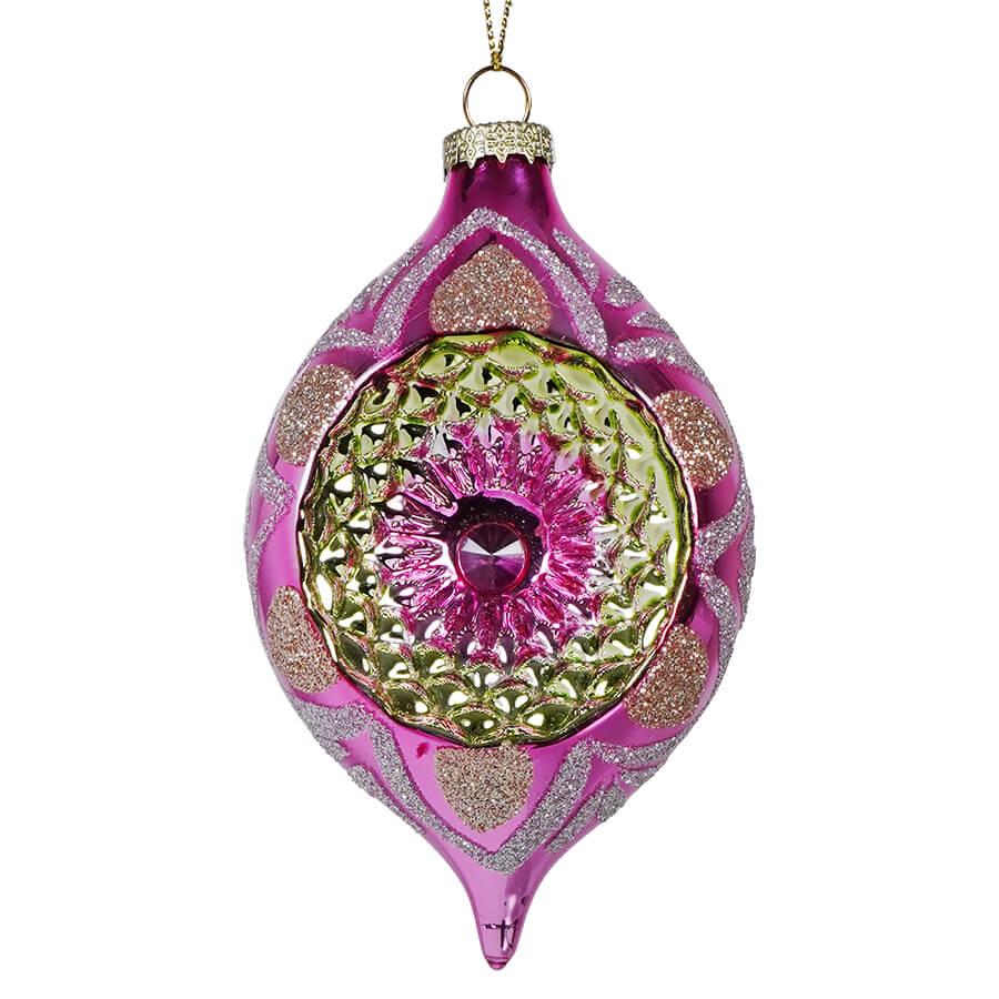 The ornament’s rich pink surface is adorned with delicate silver and gold glitter accents that shimmer like frosted lace. Its centerpiece is an eye-catching reflector, with dazzling layers of lime green, gold, and fuchsia radiating outward in a mesmerizing design. Whether placed near glowing string lights or given a prime spot on the tree, it creates a beautiful play of color and shine that’s impossible to miss.
