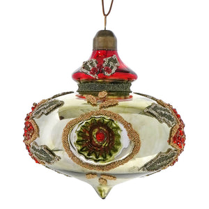Glass Red & Olive Reflector Floral Design Finial Ornament
