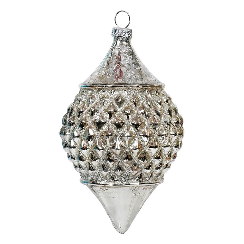 The surface of this ornament is intricately designed with a hobnail pattern, adding depth and texture that capture and reflect light with every turn. Sprinkled with fine silver glitter, it sparkles brilliantly, highlighting the exquisite detail of its craftsmanship. Measuring 5.25, this finial-shaped adornment stands out, drawing eyes with its stately charm.