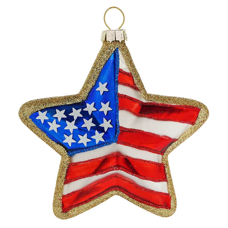 Crafted from delicate glass and adorned with shimmering gold glitter, this ornament is a festive fusion of elegance and patriotism. But the real showstopper? It's the dazzling design of the American flag, brought to life with red glitter for the stripes and blue glitter outlining that iconic square of stars.