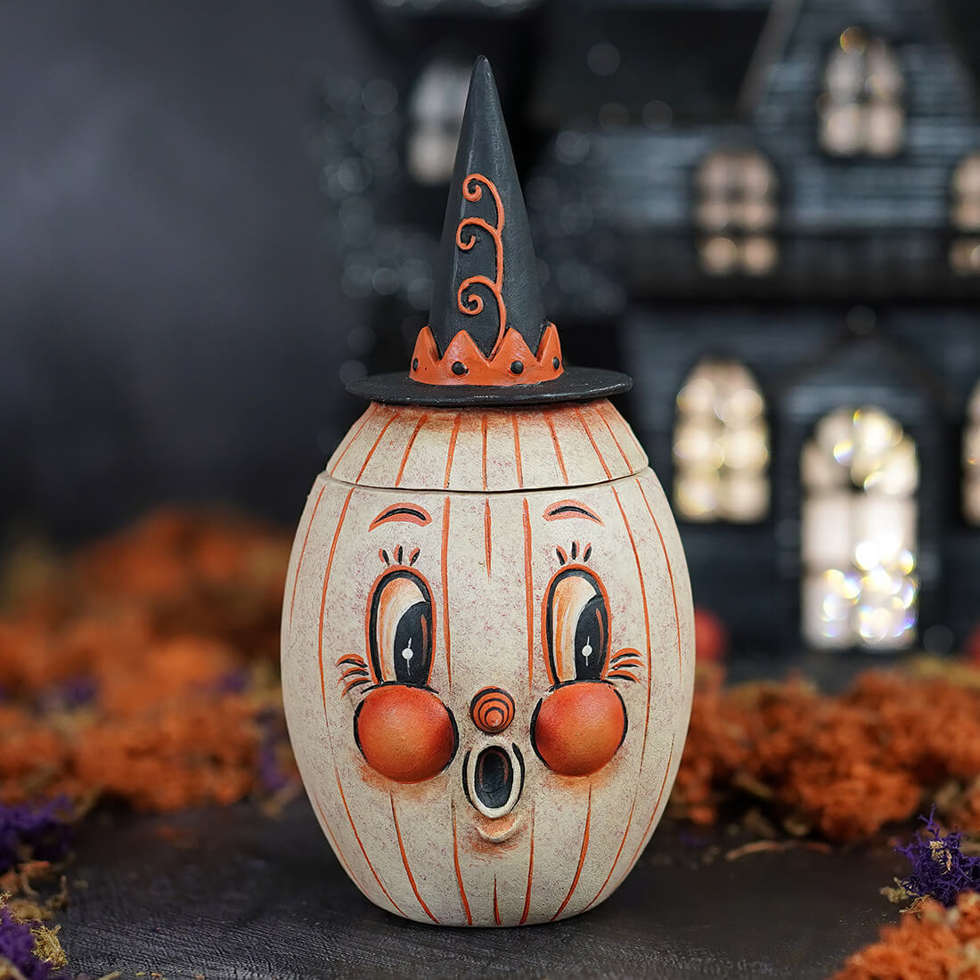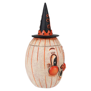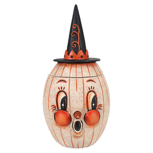 The Gourdy White-O-Ween Container by Johanna Parker for Bethany Lowe Designs is another addition to Johanna's "O'-Ween" collection. It's ghostly shape gives it a touch of old-fashioned charm. This wide-eyed white pumpkin is caught in a moment of spooky surprise, making an adorable “boo” face that’s more sweet than scary. Topped with a black and orange witch hat, he’s ready to bring a little playful mischief to your autumn displays.