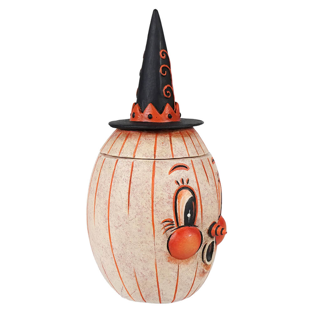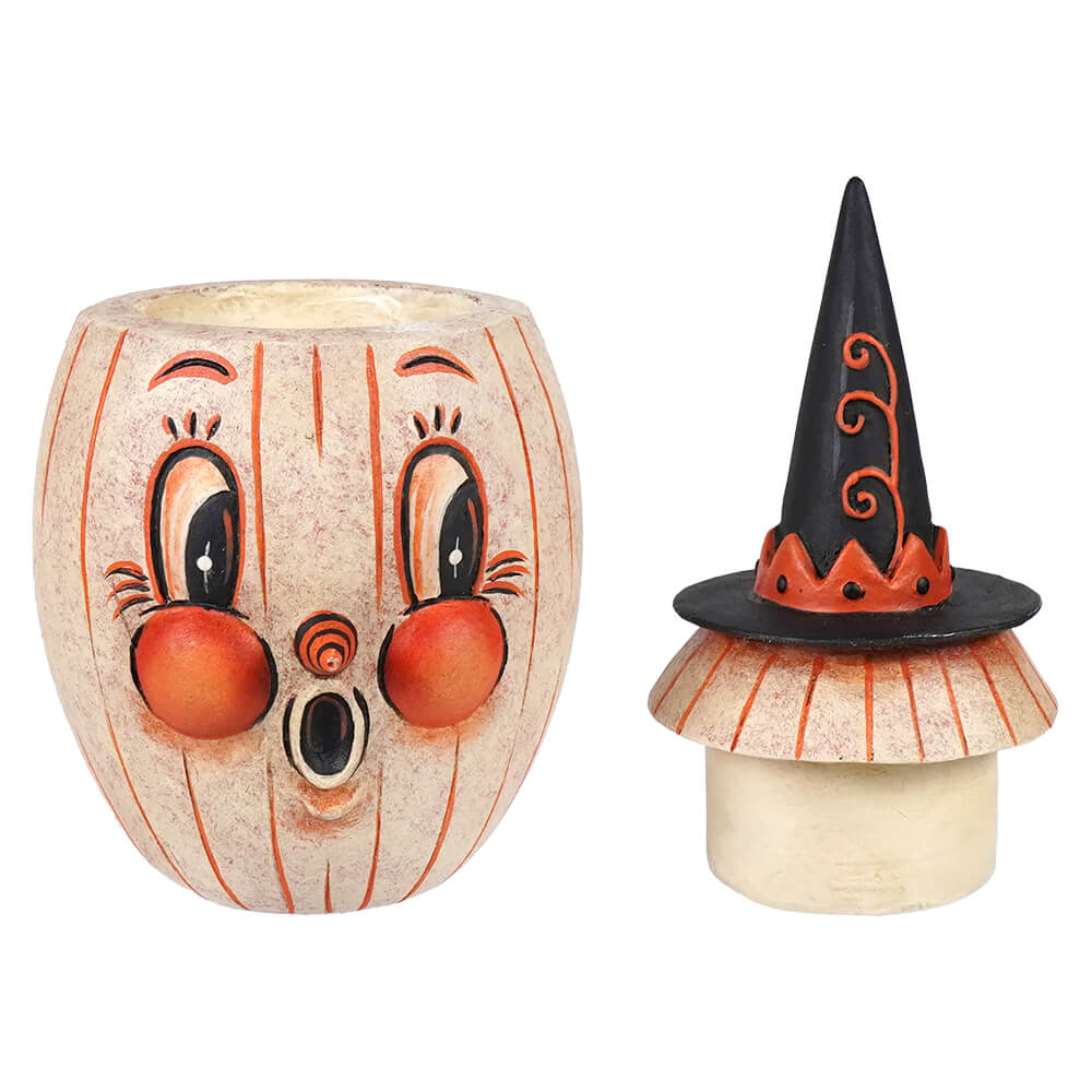 But this pumpkin isn’t just for looks—lift off the hat and the top of the container to reveal a hidden compartment perfect for storing Halloween treats, trinkets, or even a secret stash of candy corn (we won’t tell!). Whether you place him on a mantel, a tabletop, or among a display of vintage-inspired decorations, he’s sure to steal the show.