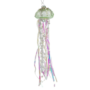 This light green jellyfish is a terrific ornament to hang on or even above a sea themed tree. The translucent green glass portion of the ornament is detailed with beads and faux jewels, and then iridescent cellophane streamers and bead strands hang from the ornament like tentacles to really pick up and reflect the light. A true standout piece for your sea themed tree!