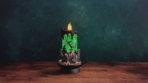 At the base, a detailed graveyard scene unfolds, complete with tombstones, skulls, and crows, all set against a backdrop of glimmering green light. The swirling water inside the globe brings the scene to life, with shimmering particles that catch the light, adding a dynamic element to the overall design. The top of the lantern features a dripping black wax effect, with a flickering flame that mimics the eerie glow of a real candle, enhancing the haunting vibe.