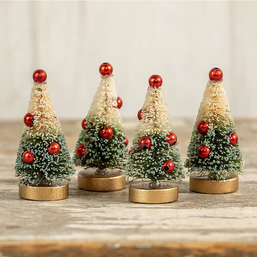 Let this mini, festive forest add some yuletide cheer throughout your home this Christmas. This little group of evergreens can make any room merry when displayed as a set or added as a finishing touch to a vignette of holiday figures. The Green Striped Bottle Brush Trees With Red Beads comes in a boxed set of 4. The trees are a festive striped bottle brush with red bead embellishments on a little round wood base. They make a great gift for someone who wants to add some holiday spirit to their Christmas village display. Decorate your tables, mantels and shelves with no muss or fuss when it comes to packing and unpacking these treasures!