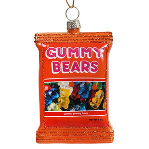 The simple glasswork replicates a glistening bag of gummy bears, complete with an image of the sweet snack that seems to shimmer in the glow of twinkling tree lights. Each bear looks ready to be plucked from its candy confines and enjoyed during holiday festivities.