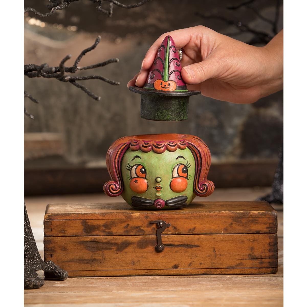 With her verdant complexion, eyes aglow like twin harvest moons, and cheeks that are the perfect blend of mischief and magic, Hagatha Hollow is more than just a container – she's a keeper of secrets and a guardian of your most prized possessions. Topping off this whimsical creation is a pointy witch hat in shades of purple and green, complete with a pumpkin emblem that adds a touch of pumpkin spice to her already spellbinding style.