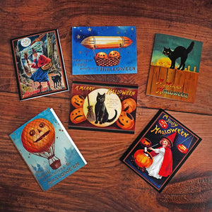 The set includes a variety of playful vintage illustrations: a witch in a moonlit forest with her broom and black cat, a second black cat perched beside a broom, and a young girl dressed as a witch surrounded by glowing jack-o’-lanterns. Each card is printed on high-quality cardstock, making the vibrant artwork pop and giving your greetings a touch of artistry and charm.