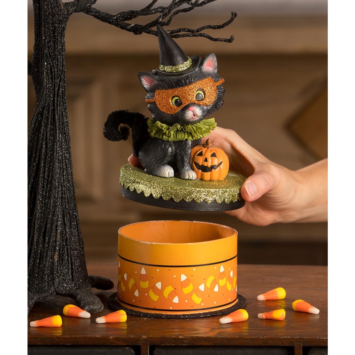 Imagine a round box with an orange candy corn paradise below and a black and glittery green lid above – it's the perfect stage for our star, Kitty Binks! This mischievous black kitten is not your average feline; it's a stylish sorcerer sporting a glittery orange face mask, making safety look oh-so-chic. White paws and a fluffy black tail add an extra touch of elegance to this enchanting kitty.