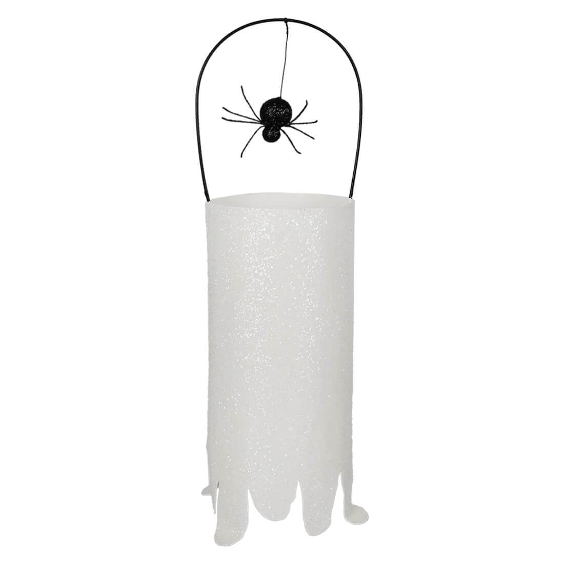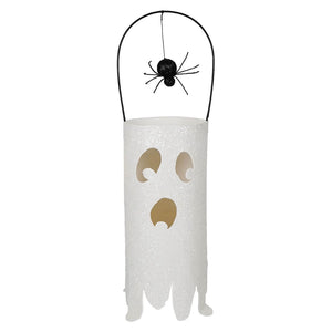 Behold a glittering cylinder of spectral splendor, adorned with the mischievous visage of a ghostly ghoul. The face cutout casts an eerie glow, giving your surroundings an otherworldly ambiance that's both enchanting and a tad haunting. But that's not all – above the lantern, a handle adorned with a dangling black spider adds a creepy crawly touch. It's a lantern that hangs with eight-legged flair!