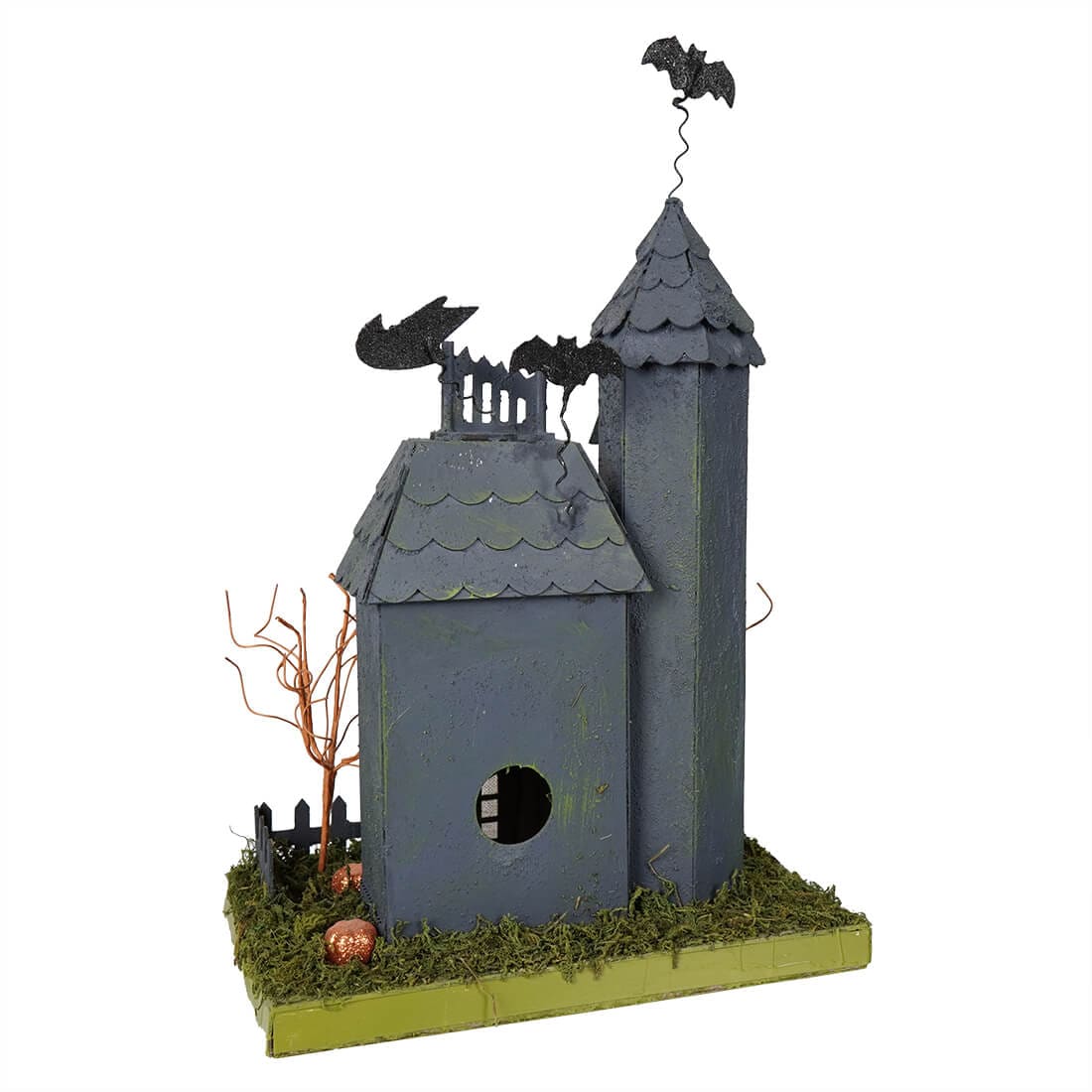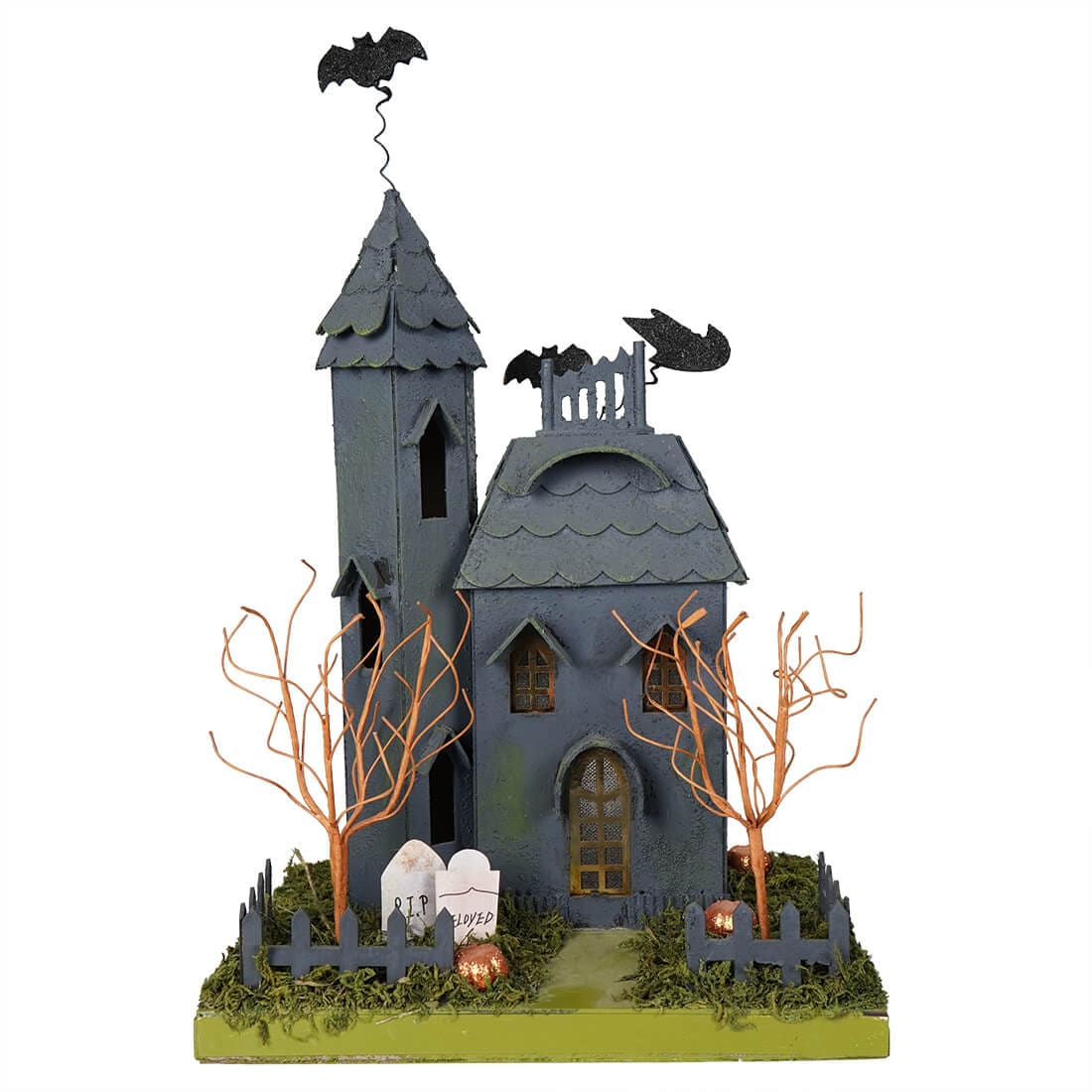 Cody Foster's Halloween putz houses are perfect to start or add to your Halloween village! The grayish haunted mansion with tower has a grave yard and creepy trees in it's front yard. There is an old fence set in dried moss ground cover with bat above the tower.