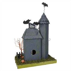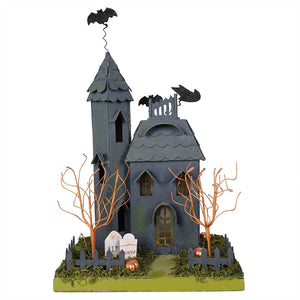 The Haunting Halloween Cottage is a vision of ghostly elegance, standing as a beacon for all things eerie. At 14 inches tall, this paper mache marvel is a sublime addition to any Halloween decor, inviting the whispers of the wind and the tales of the night. Its slate-grey facade is crowned by a silhouette of a crow perched atop twisted wire, casting a watchful eye over the autumnal scene.