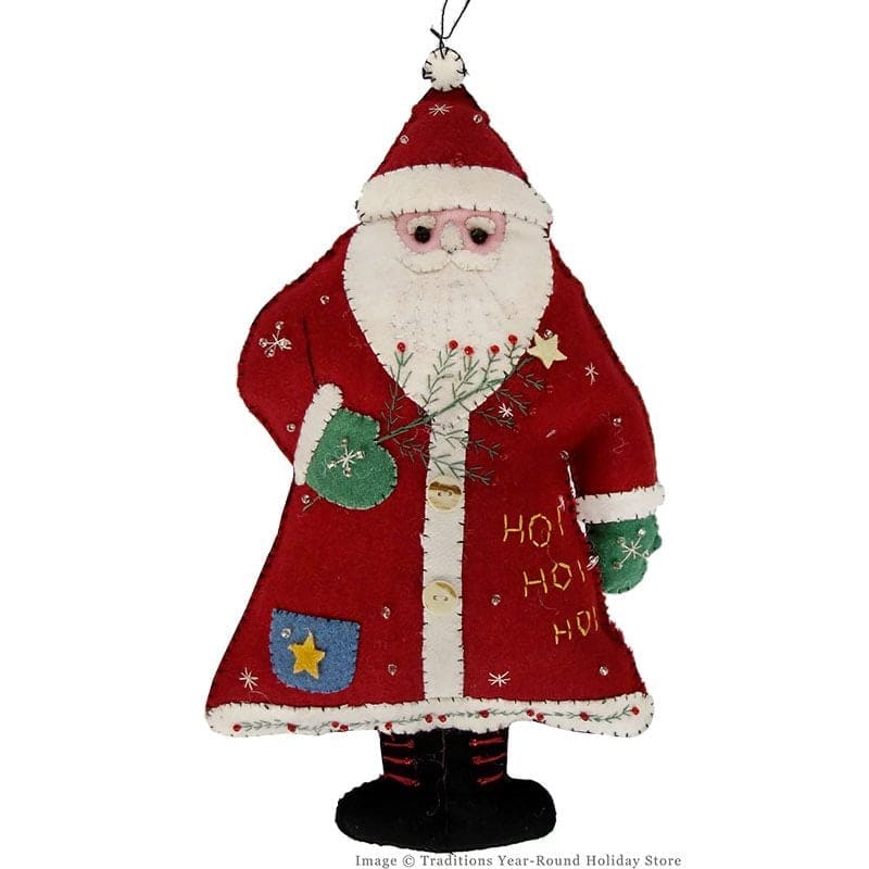 Unveiling the jolliest guy in town – the Ho Ho Ho Santa with a Tree Ornament by New World! This hand-stitched sensation isn't just an ornament; it's a whimsical masterpiece crafted from the finest wool, felt, and beads, delivering holiday cheer with every stitch.
