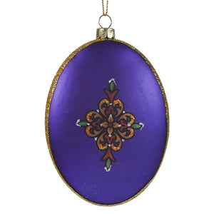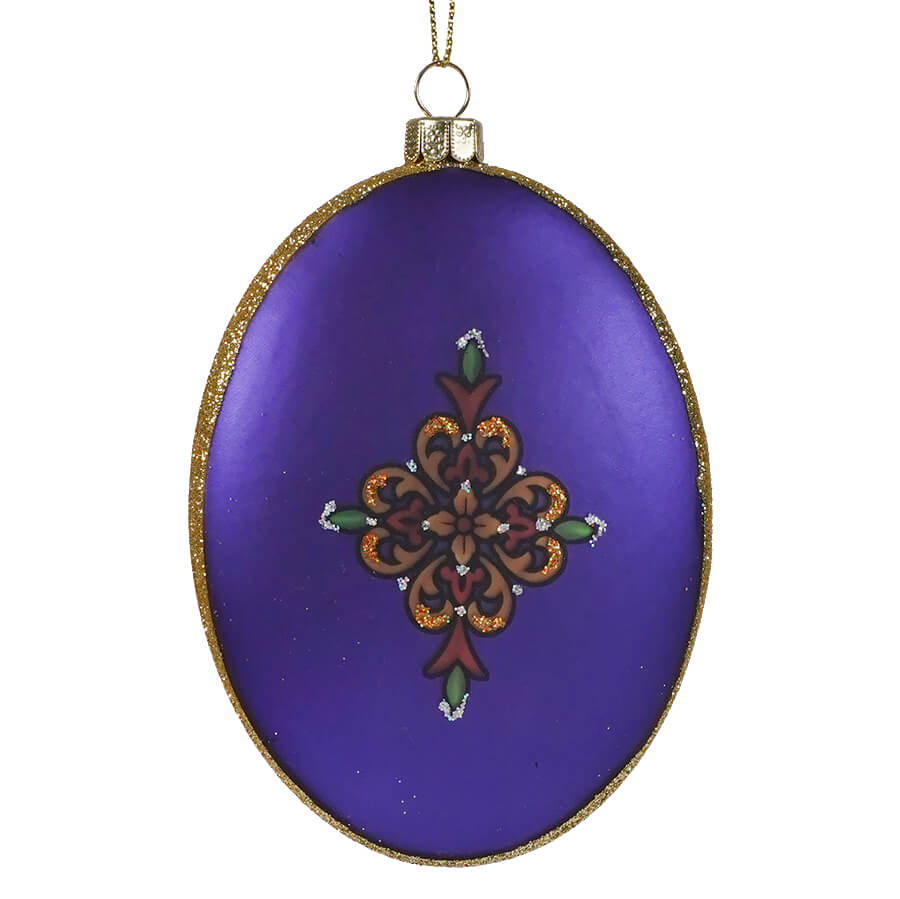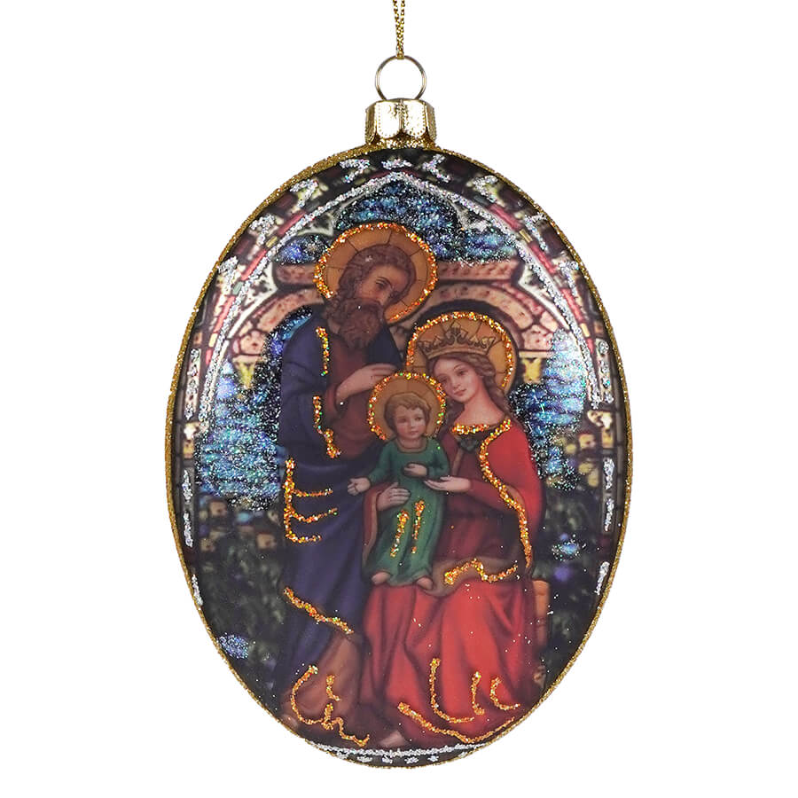 Framed in a fine gold border, this 5.25-inch Holy Family oval glass ornament features a beautifully detailed scene that feels like a classic work of religious art. One side presents the Holy Family, with Mary, Joseph, and the young Christ child seated together in a moment of quiet unity. The reverse side features a smooth, satin-like purple background, centered with an ornate cross design.