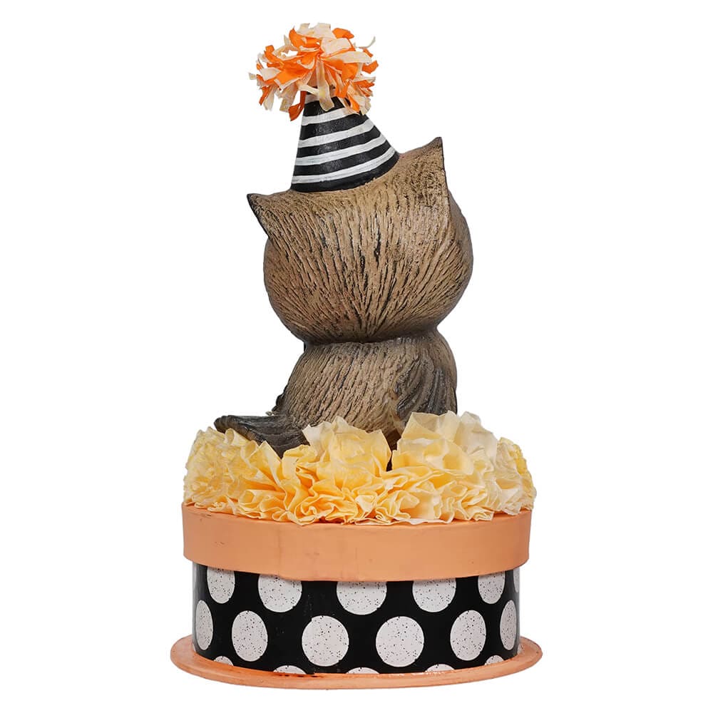 Besides ghosts, black cats, witches well the list could go on and on...Owls are also another fun way to add to your Halloween decor! We are fond of all trinket boxes, but this charming Hoot On Box features a small owl figurine wearing a dapper party hat while holding a festive sign that reads "Trick or Treat", setting the stage for a night full of fun, frightful surprises.. Perched atop a black-and-white polka dot box with an orange lid accessorized with orange crepe paper, this wide-eyed hootie owl figure is ready to make your haunted home even more festive.