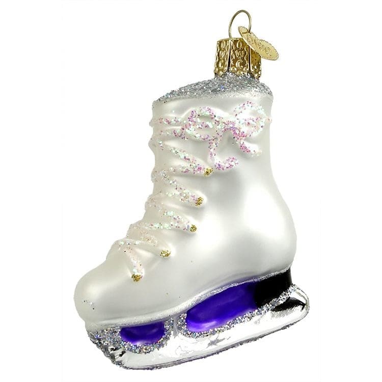This 3.5-inch glass treasure captures the quintessential ice skate with a classic pearly white finish, complete with sparkling glitter accents and a gleaming silver blade. The blade's grooved front edge, designed for precision braking on ice, is replicated in detail, showcasing the thoughtful craftsmanship of the ornament.