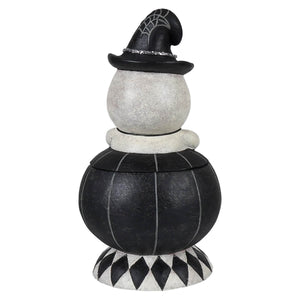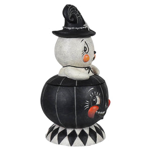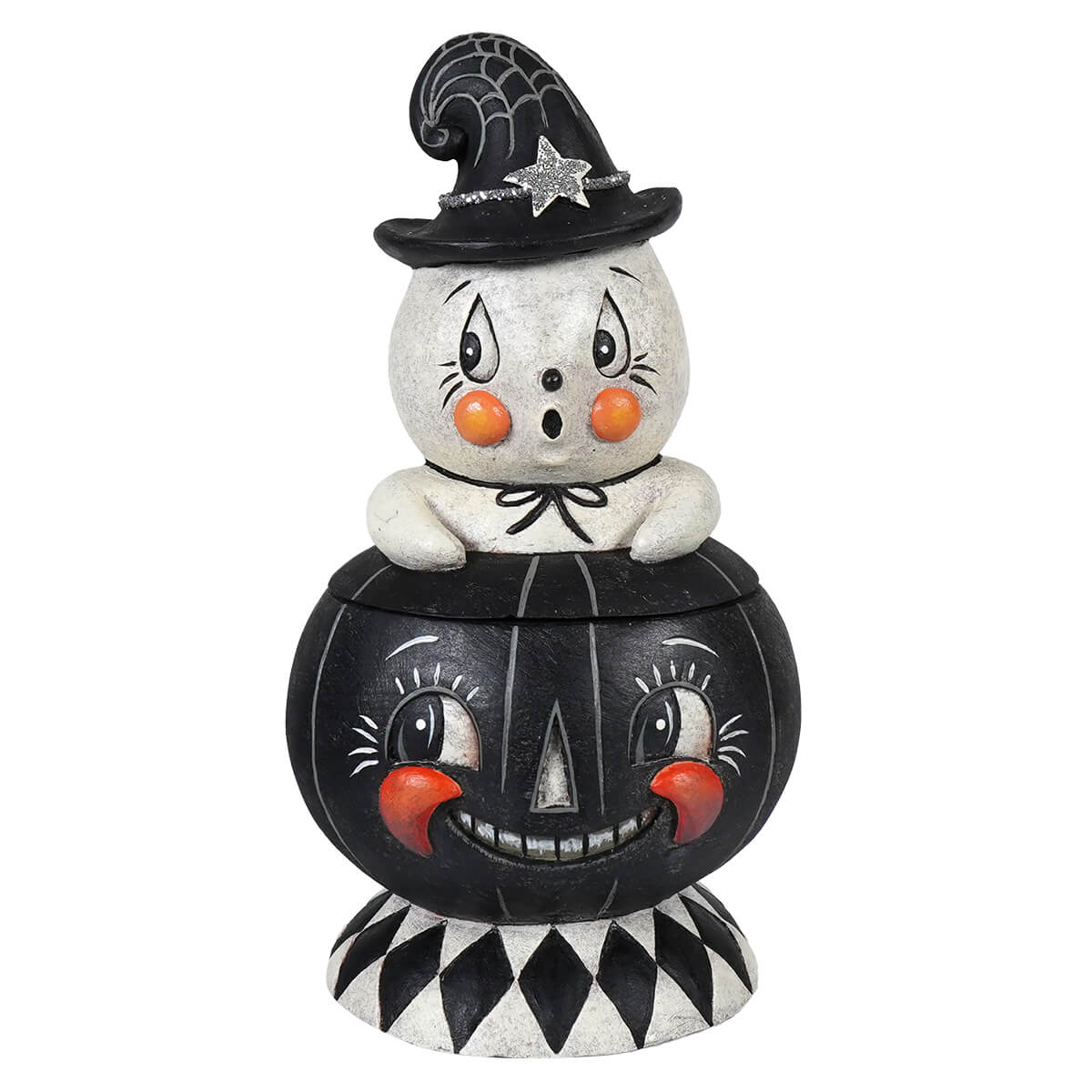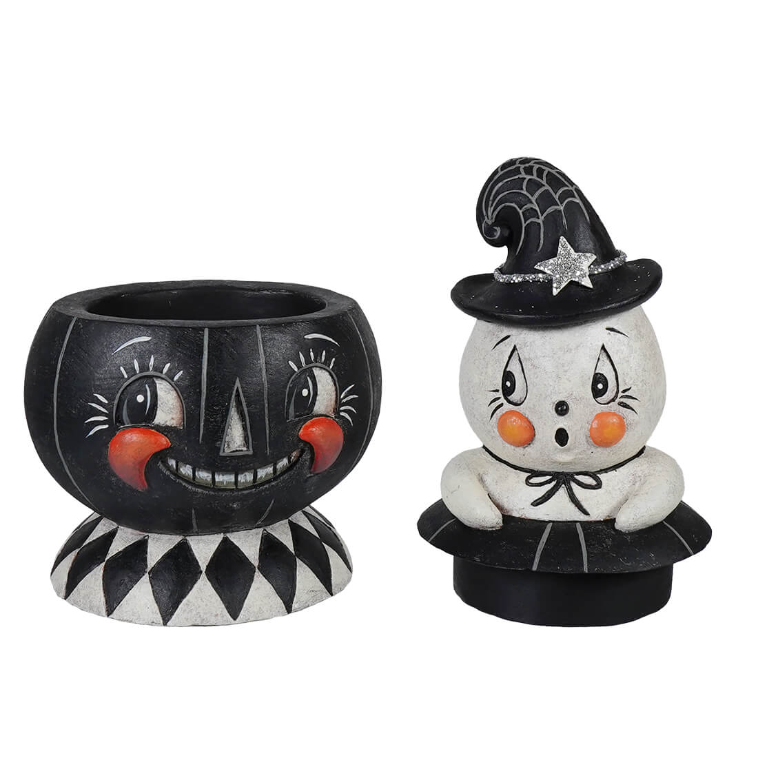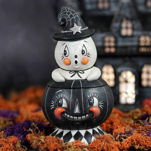 Peek-a-BOO! The Incognito Gus & Tito Container by Johanna Parker for Bethany Lowe Designs is a delightful game of hide-and-eek! At first glance, you’ll see a mischievous black jack-o’-lantern named Gus, grinning from ear to ear. But lift the lid, and surprise you see Tito, the sneaky little ghost in disguise, donning a classic witch hat as he peeks out from his pumpkin hideaway.
