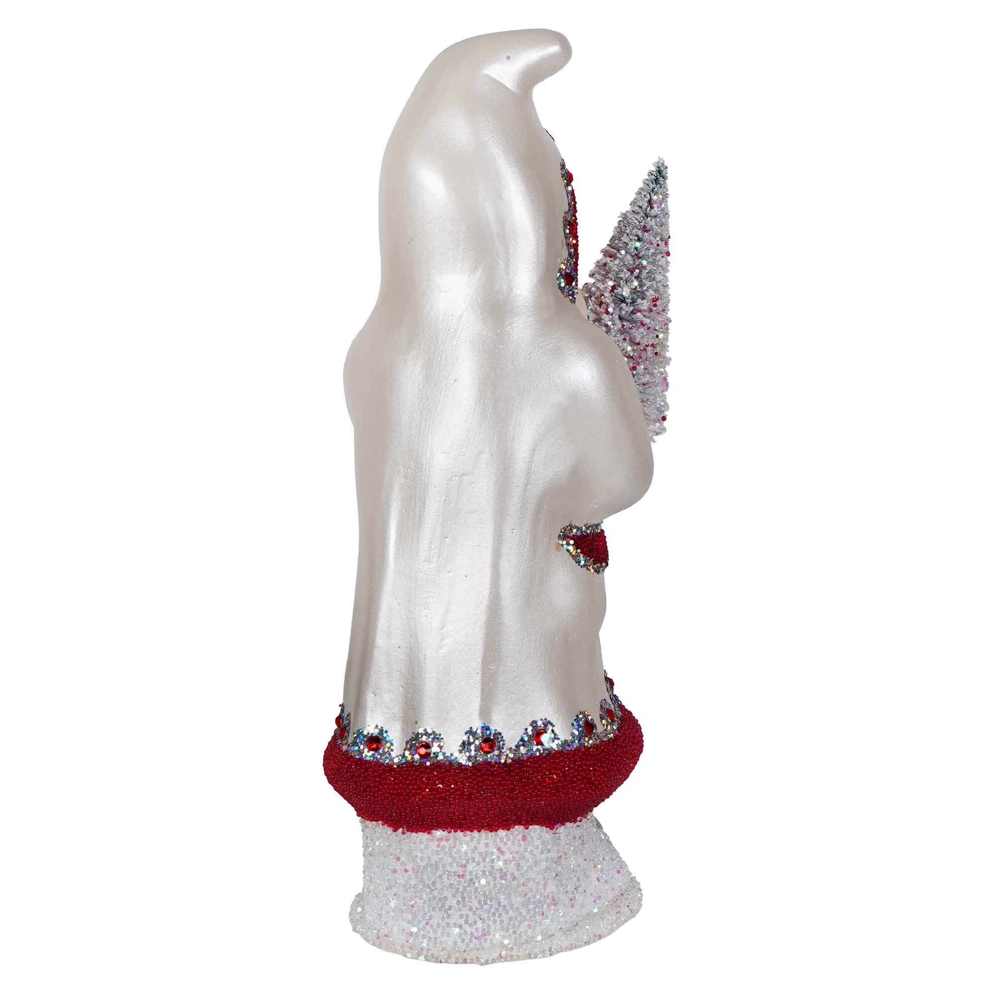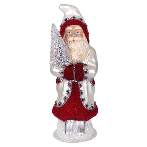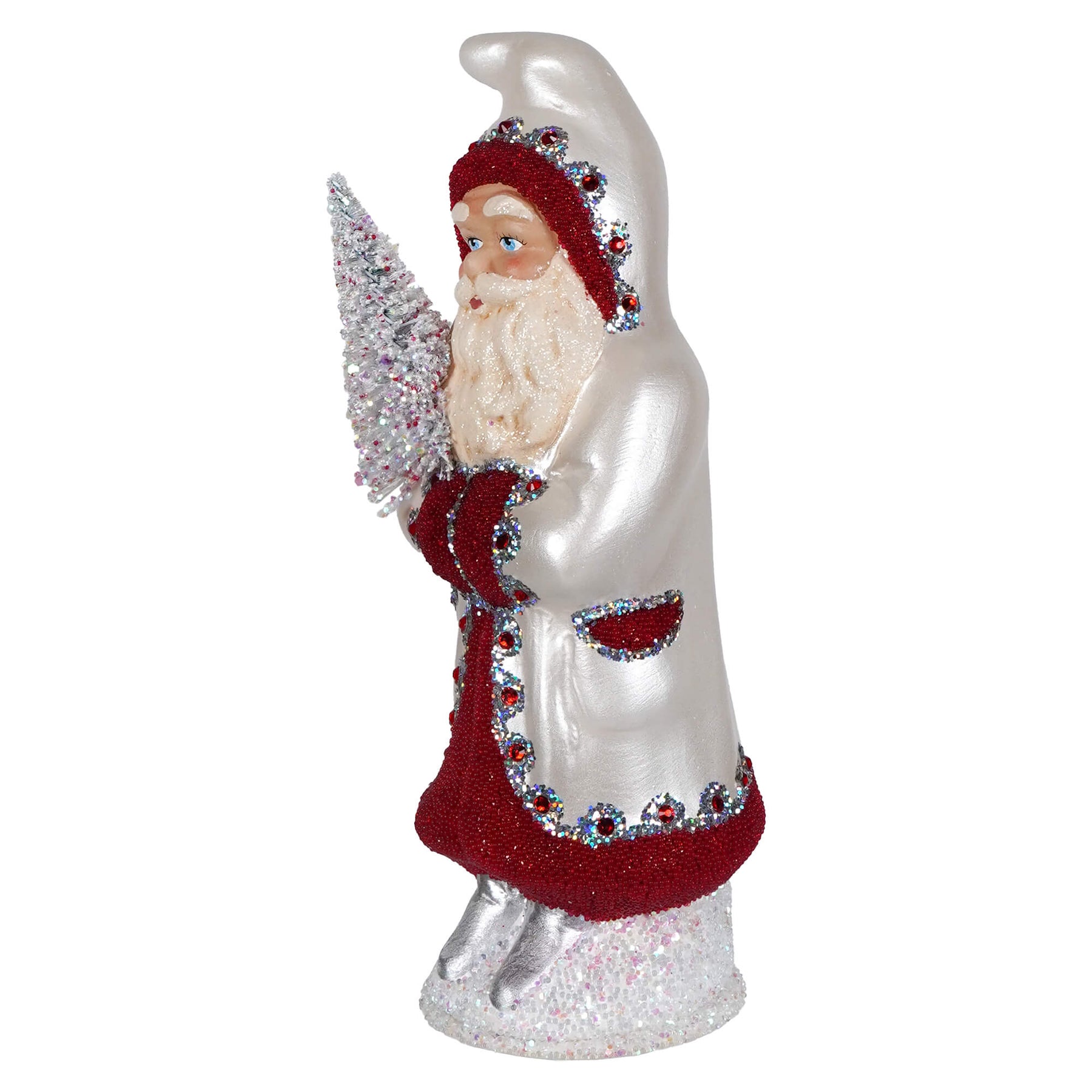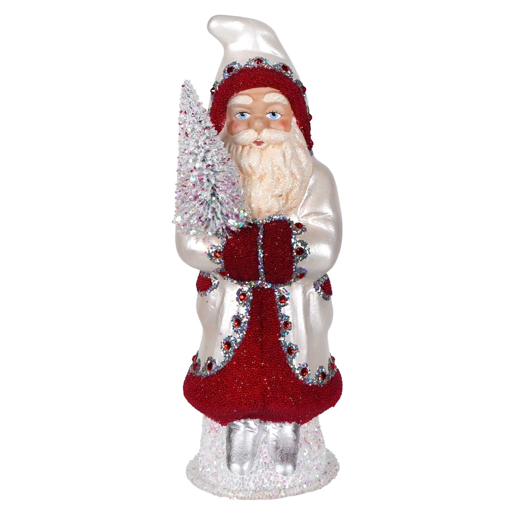 Dashing through the snow in serious style, the Pearl White & Red Beaded Santa Holding White Tree by Ino Schaller is here to sleigh. Draped in a snowy white coat trimmed in festive red, Santa’s look is as crisp as a December morning and twice as magical. Red bead accents add just the right amount of sparkle—because even Kris Kringle knows a pop of glitter never goes out of season.