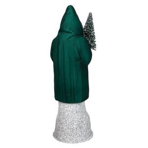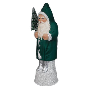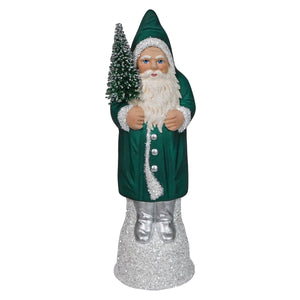 Dressed in a luxurious petrol coat, this Santa brings a fresh and elegant look to your festive decor. The deep, rich color of his coat is contrasted by the bright white trim that sparkles as if dusted with freshly fallen snow. His silver boots add a modern twist, catching the light and giving him a polished appearance. In his hand, Santa carries a festive green Christmas tree, its branches covered in a dusting of glitter, ready to bring the holiday spirit into your home.