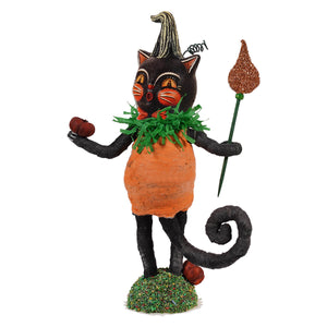 Jack O’ Cat by Vintage by Crystal & Johanna Parker is ready to pounce into your Halloween décor with a playful mix of feline charm and festive flair. Dressed in a pumpkin-inspired costume, this black cat is the perfect combination of spooky and sweet, with a stem atop its head and a bright green ruff framing its face.
