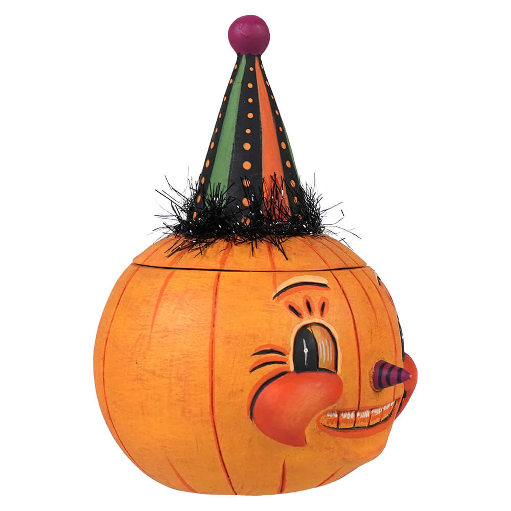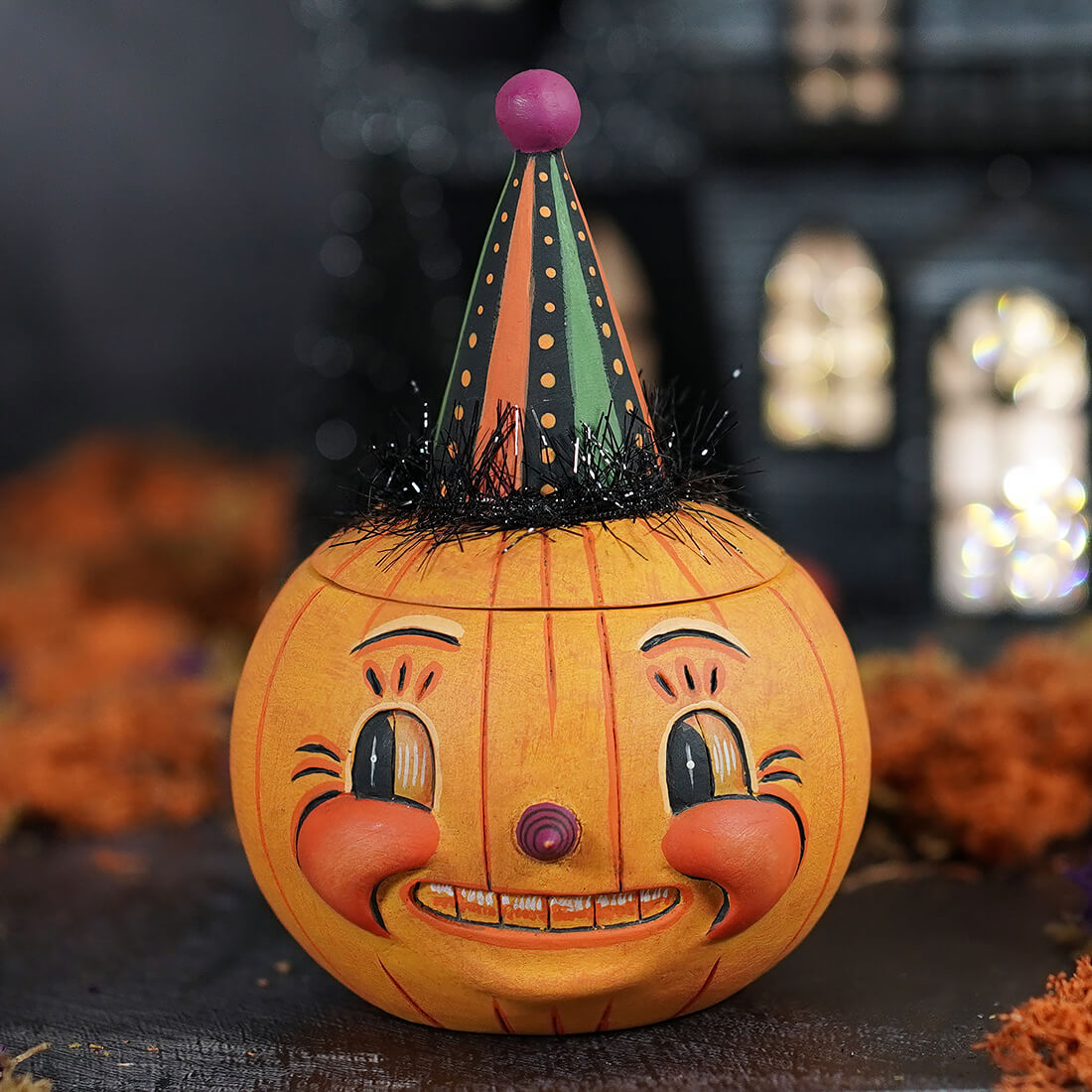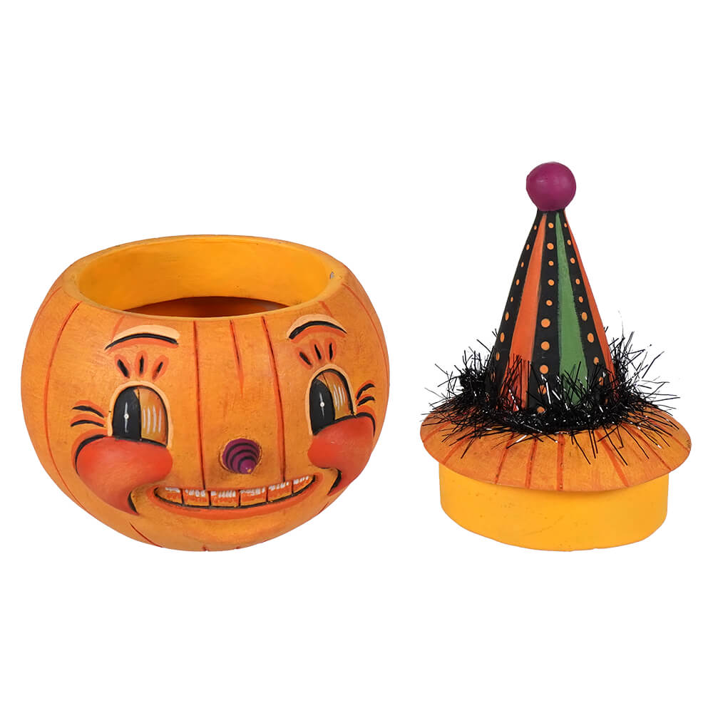 Get ready to stash your treasured small items in the most spook-tacular way with Jackie Yell-O-Ween by Johanna Parker for Bethany Lowe Designs! With a grin as bright as a full moon on Halloween night, this cheerful jack-o'-lantern is all about festive fun. Perched atop his head is a playful party hat—because every candy-filled night deserves a little extra flair!