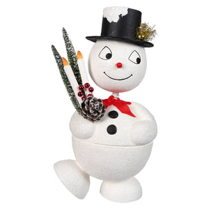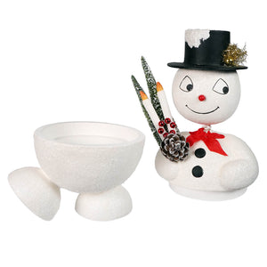 The Jolly Bobble Snowman Container by Bethany Lowe Designs arrives dressed to impress, sporting his dapper black top hat, bright red bow tie, and a festive armload of treasures—two candles, a pinecone, and a pair of tiny evergreen trees that make him look like he’s ready to headline his own holiday parade. Give him a gentle lift at the center, and he opens up to reveal a hidden compartment perfect for stashing treats, trinkets, or the secrets of how he manages to look this cheerful all season long.