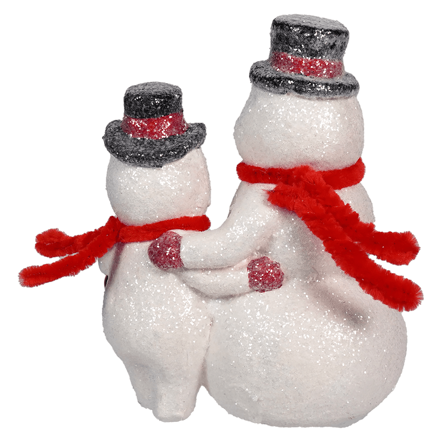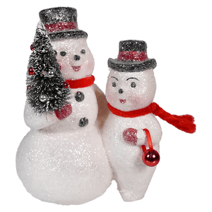 The duo figurine has a delightful glittered texture that catches the light, giving these snowmen a frosty sparkle that brings them to life. One snowman carries a festive bottle brush tree, complete with tiny ornaments, while the other holds a bright red bauble, ready to deck the halls. The little details, like their matching black top hats and red scarves, add a coordinated touch that makes this pair a standout piece for any holiday decor.