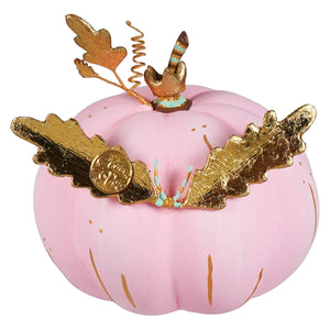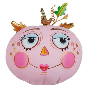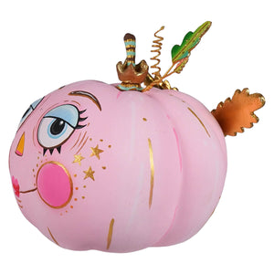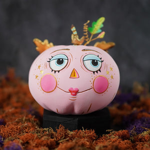 Painted a pale bubblegum pink, this pumpkin wears her expressions with flair. Her oversized eyes, accented by long lashes and arched brows, give off a calm confidence that says she’s been through a few Halloweens and knows exactly where the candy's hidden. Metallic gold accents highlight her eyebrows, cheeks, and the star clusters near each eye, because subtle has never really been her thing. At the top, a striped stem rises between golden leaves and a bright green branch holding two-tone foliage.