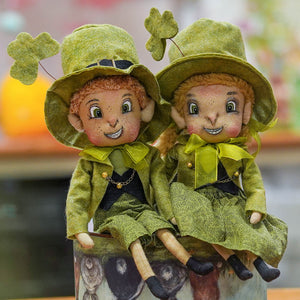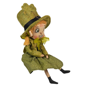Maybe it's the red hair, the shamrock hat, the pointy ears, or that impish smile, but something about Kerry tells you that she might be a Leprechaun! A St. Patrick's Day rarity by Joe Spencer, Kerry is all decked out in her favorite green outfit, featuring a soft green hat and coat with a chain across the gold buttons and a delicate vine pattern all over her dress. Her cute face will never give away where the pot of gold is, but perhaps you can overhear her brother Keiran and her whispering about it's location if you display them together this St. Patrick's Day.
