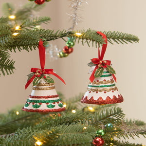 The Kitschmas Fun Bell Ornaments Set by Bethany Lowe Designs is here to make sure your holiday décor jingles with personality. This set includes two white bell ornaments, each decorated with lively red, green, and gold stripes arranged in eye-catching patterns that feel bold, festive, and joyfully retro. Topped with classic holly accents, the bells strike a perfect balance between traditional Christmas charm and playful design.