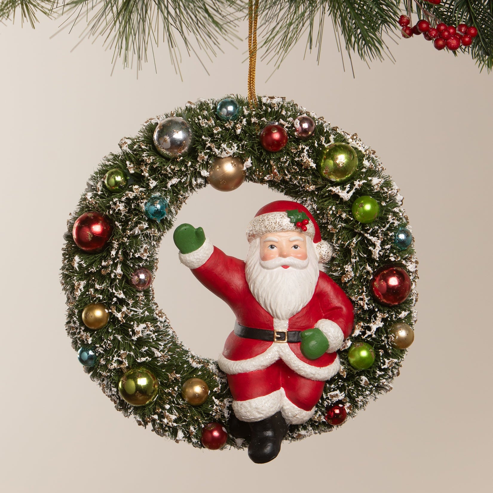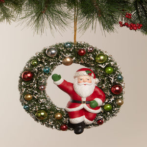 Step aside, ordinary décor—this Kitschmas Santa in Wreath by Bethany Lowe Designs arrives ready to steal the spotlight with the confidence of a retro icon who knows he’s the star of every mantel, doorway, or holiday vignette he graces. Nestled cross-legged right in the center, Santa flashes a cheery wave and an all-knowing smile, as if he’s fully aware that his entrance—framed by a lush wreath exploding with green, pink, silver, blue, and red ornaments—is about to make your guests ask, “Where did you find that?”