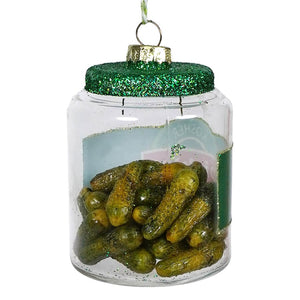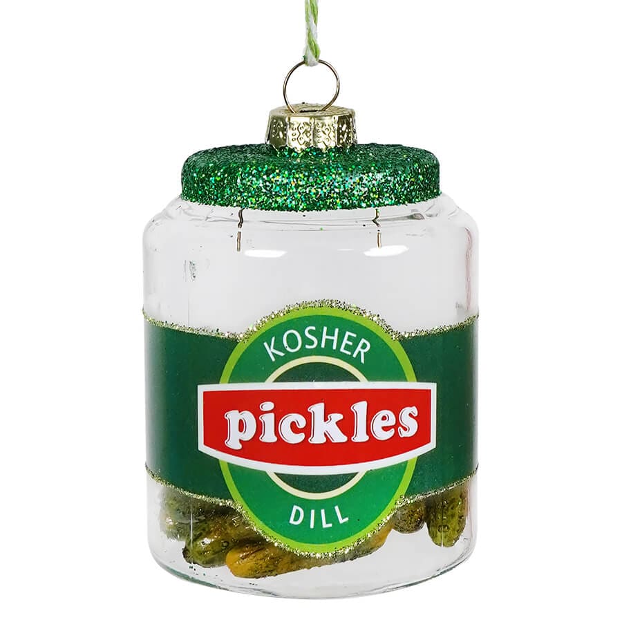 Crafted with attention to detail, this ornament features a jar of kosher pickles with a glittery green lid that sparkles like holiday magic. It's the perfect blend of savory and sparkling, sure to make your tree the talk of the town (or the deli)!