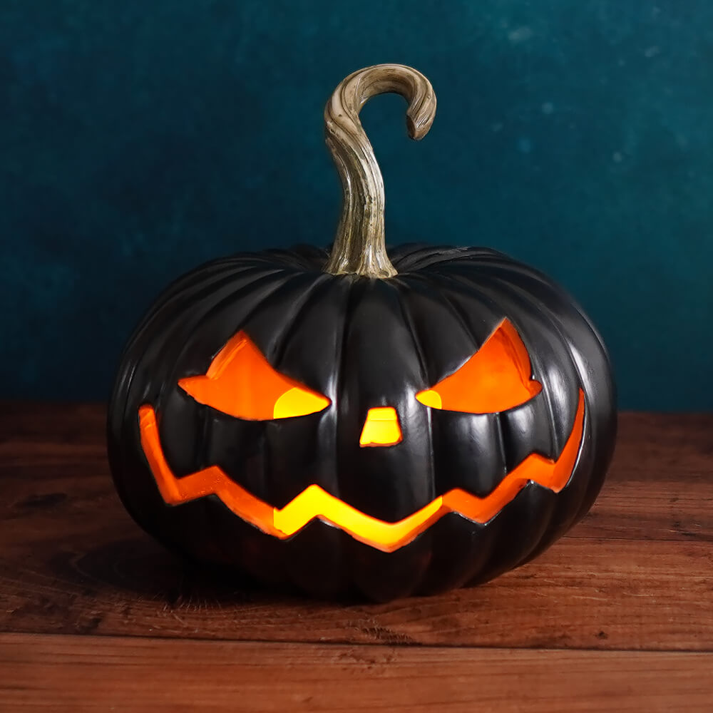 This might be our new favorite lighted jack-O-Lantern!! With its wicked grin and glowing eyes, the Lighted Black Jack-O'-Lantern brings an unmistakable eerie vibe to any Halloween display. Crafted from resin, this sinister pumpkin stands out with its glossy black finish, making it the perfect statement piece for your seasonal décor. Its bright orange cut-outs create an ominous glow that will send chills down your spine, making sure it doesn’t go unnoticed on a spooky night.