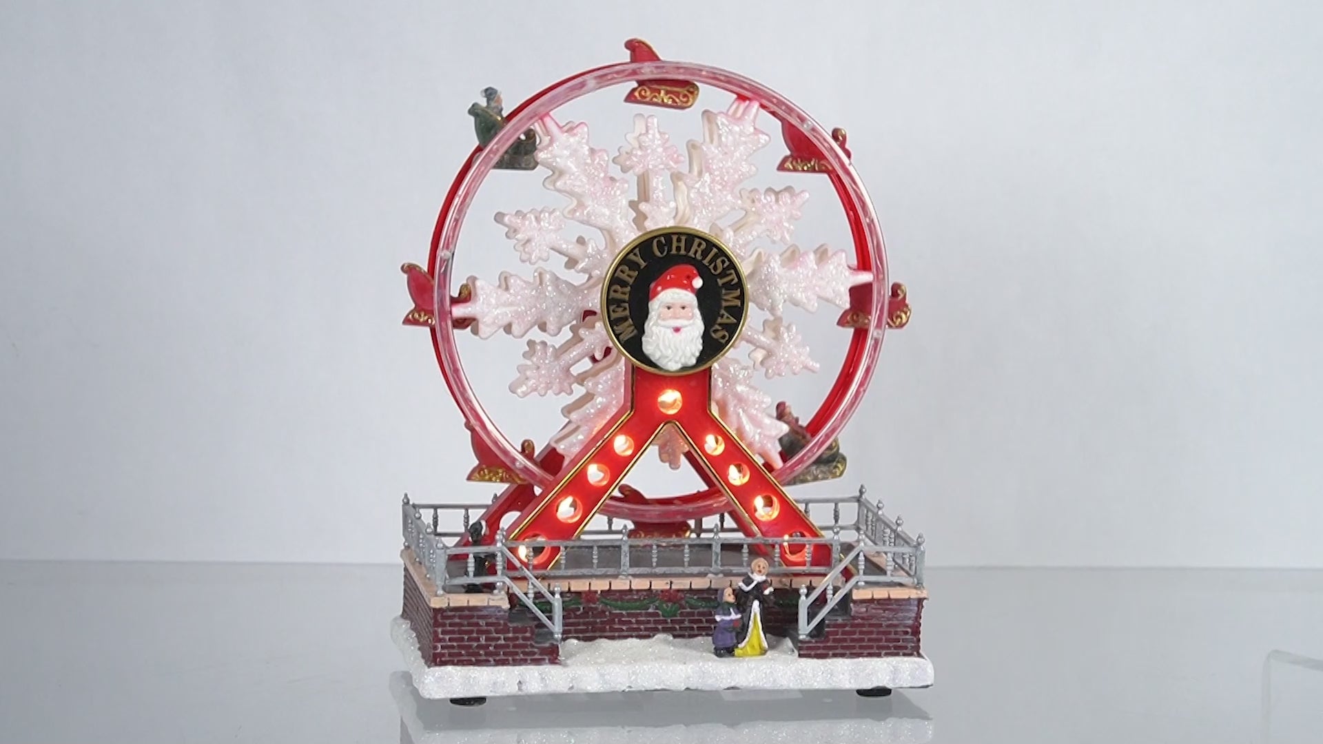 At the heart of the wheel, a cheerful Santa Claus figure beams out, holding a sign that reads ""Merry Christmas,"" spreading good cheer to all who catch a glimpse. Surrounding him, classic holiday figures take a joyous ride, each one detailed with the festive spirit in mind.