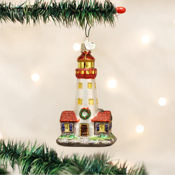 Text on Old World tag: Lighthouses are sources of inspiration and comfort. Sturdy structures with an ever-beaming light, lighthouses guide sailors to safety during dark skies and tempests. As beacons of light, they symbolize the Light of Christ, Jesus’ love, and His guidance throughout the year and the holiday season.