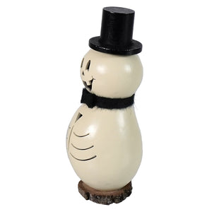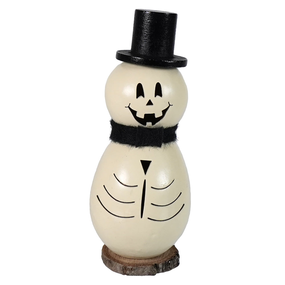 A Meadowbrooke Gourd. This winsome white skeleton is sure to make you smile. Skully was always a sharp dresser with his fuzzy bow tie and crisp top hat. His toothy grin is so charming, and the small cut outs on his front give a hint of his bony rib cage. He is the perfect size to decorate small spaces and would look great with any fall decor.