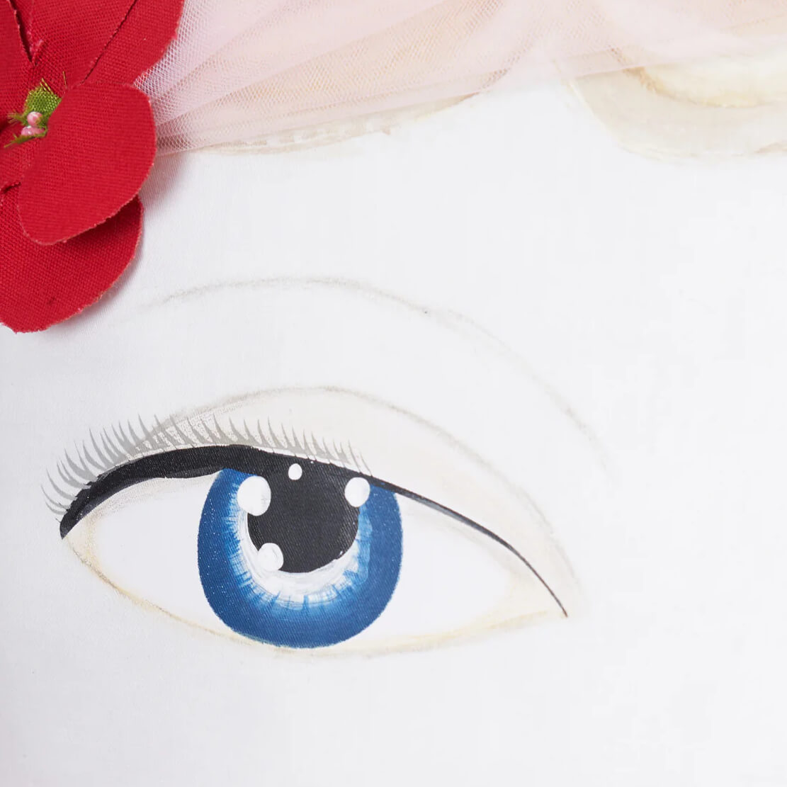 Measuring 16x6x16 inches, the pillow includes a sculpted form with extended fabric arms. One of these arms holds a smaller red heart-shaped cushion. The arms are further accentuated with sheer tulle fabric and soft pink details, giving the design additional softness and texture. Blonde fabric hair is adorned with red floral embellishments, complementing the overall aesthetic.