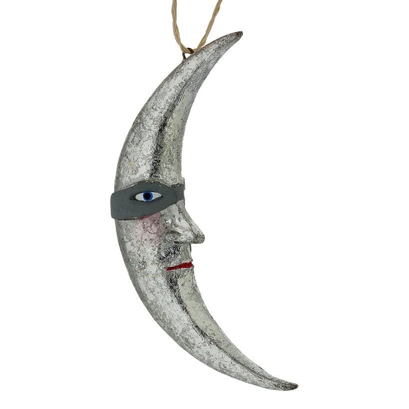 This crescent moon is up to no good, trying to steal a few hours of daylight to make the night last longer. He tries to hide his identity with a bandit mask, but his shiny, luminous silver exterior gives him away. Whether you hang this rapscallion on a Halloween tree, Christmas tree or somewhere new, he's sure to warrant a double take!