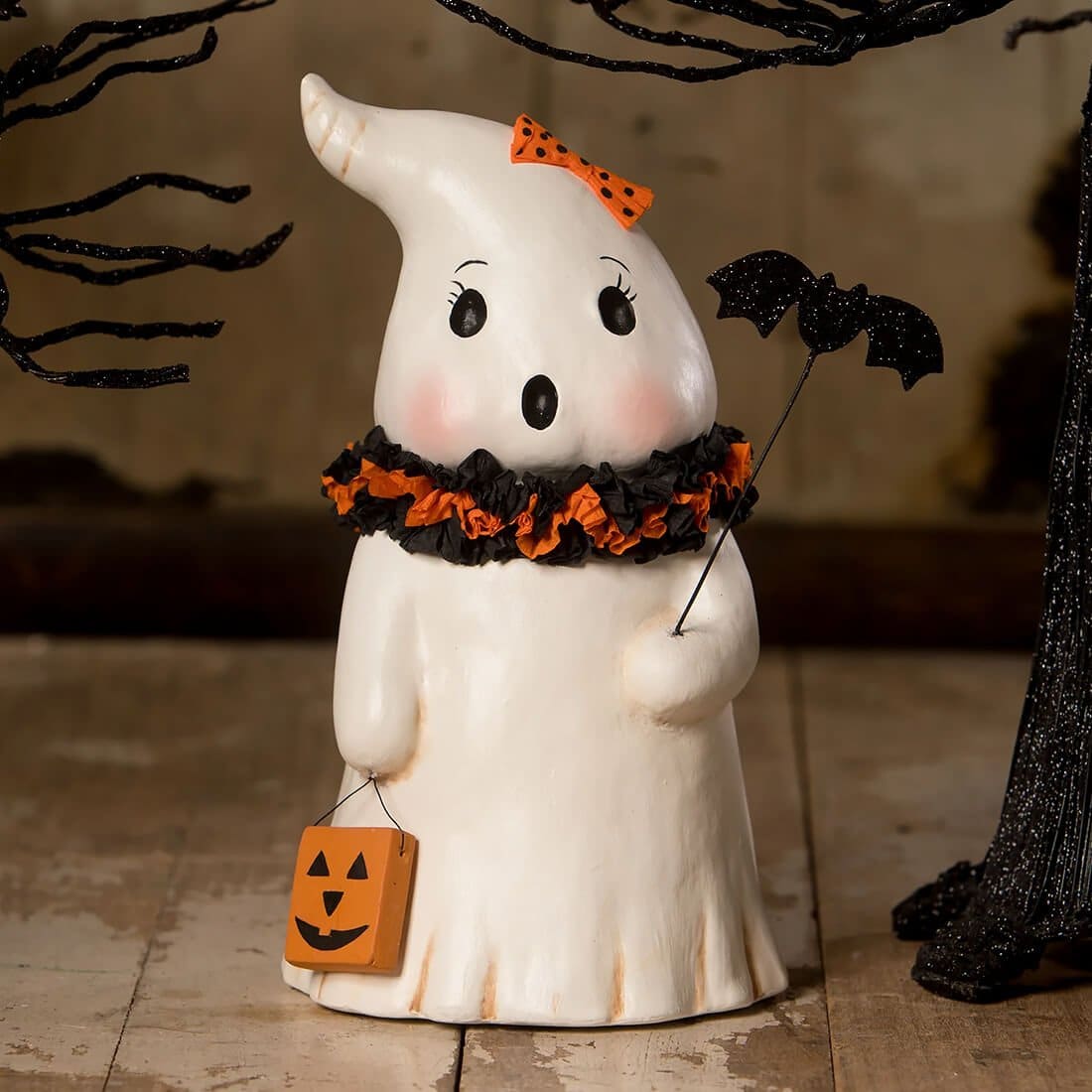 Michelle Allen has added a new, larger piece to her collection of ghost figures. We just love Mama Boo and her batty little buddy! This perfectly spooky duo is sure to bring the screams and thrills of Halloween to your home. Mama Boo will be perfect for adding a bit of festive flair to any room of the house, as she's too cute to miss with her pumpkin bag! Whimsy is the name of the game here - you can bet that laughter will echo around your halls this Halloween with Mama Boo around. She's sure to enchant everyone who passes through your doors, so if you want a ghostly and stylish way to decorate for this season, then look no further than Mama Boo!