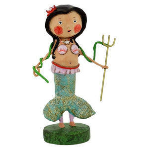 Ah, Marina Mermaid, a captivating creature of the deep, brought to life in the enchanting world of Lori Mitchell's beach collection. As the god of the sea, Poseidon himself cannot help but be drawn to Marina's ethereal beauty and playful spirit. She is a true gem, crafted from painted resin, with a shimmering fish tail costume, carrying a golden trident, her arms wrapped with delicate seaweed accents and she wears clever clam shell bathing suit top.