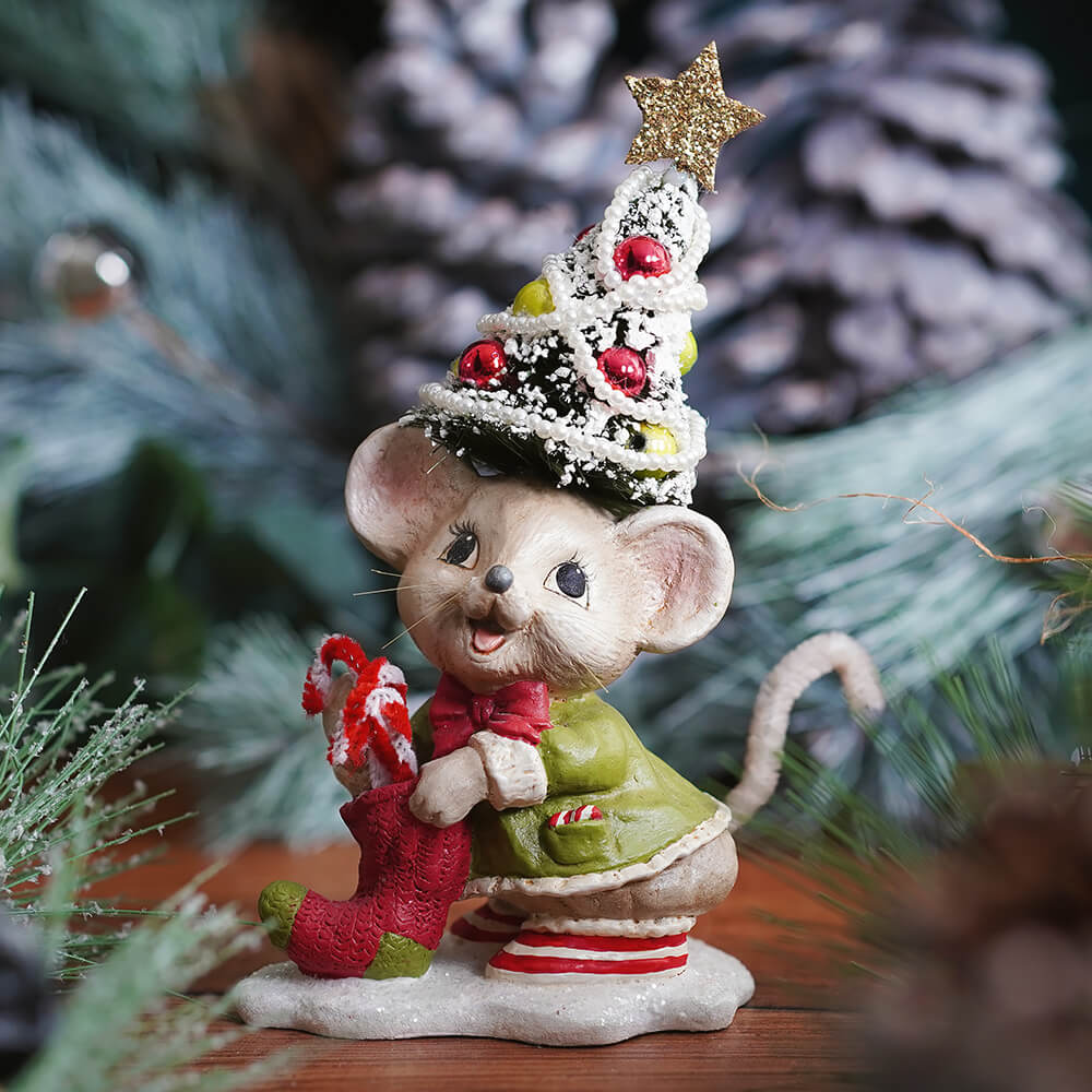 Memzi Mouse is a charmer and wil bring a merry touch to your holiday décor! This adorable little friend, designed by Bethany Lowe, stands 6.25 inches tall and is decked out in holiday cheer. Memzi wears a festive green coat and has a Christmas tree hat that’s sprinkled with colorful ornaments and topped with a glittery star. In her tiny hands, she clutches a bright red stocking brimming with candy canes, adding a playful spirit to her look.