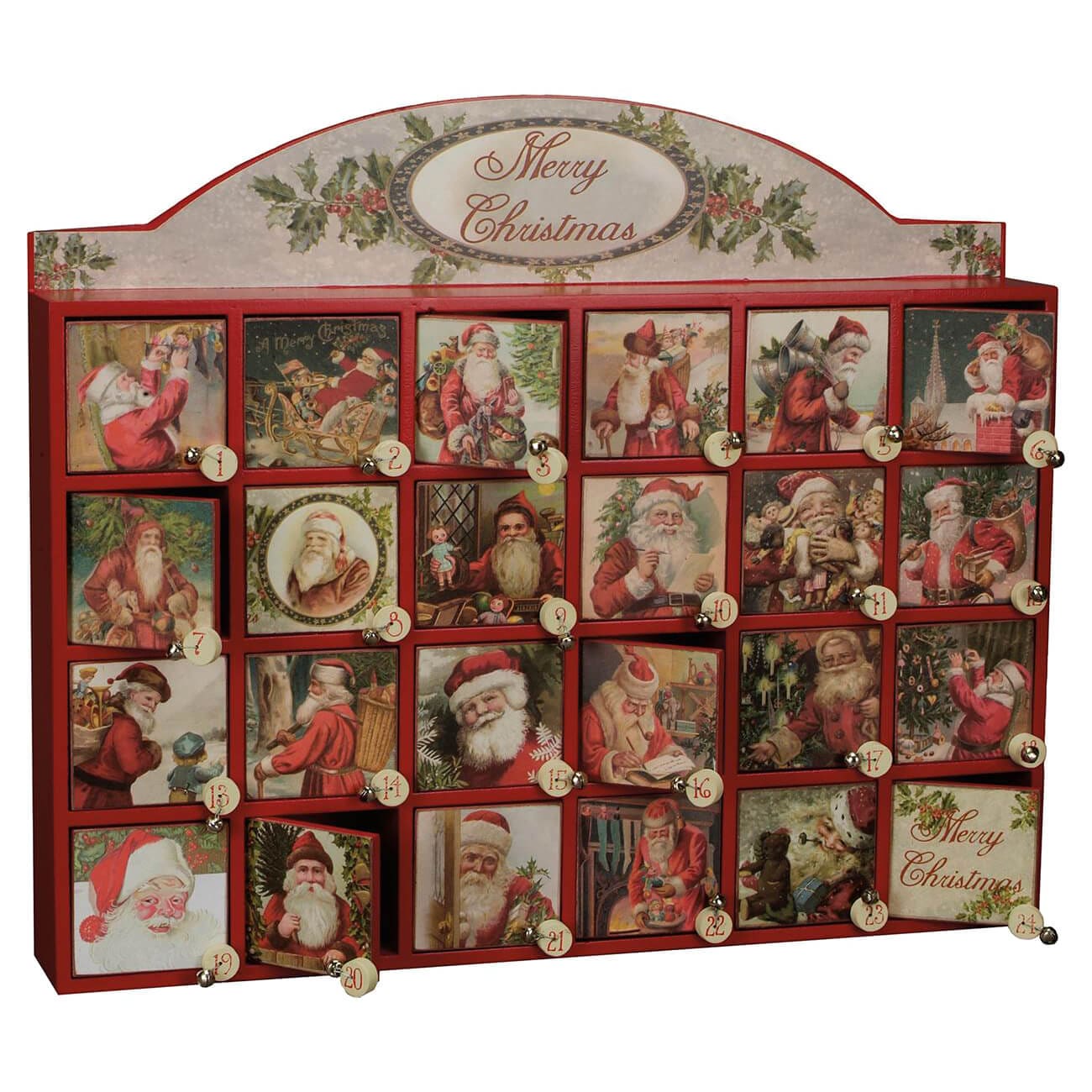 As the days wind down to Christmas, this countdown box becomes a joyful tradition. Each door features a number corresponding to the day of the month, accompanied by a mini bell and a vintage picture of Santa, adding a nostalgic and festive touch. The Merry Christmas Countdown isn't just a decorative piece; it's an interactive experience that sparks anticipation and holiday cheer.