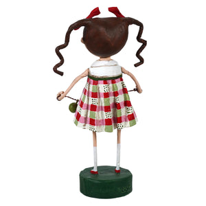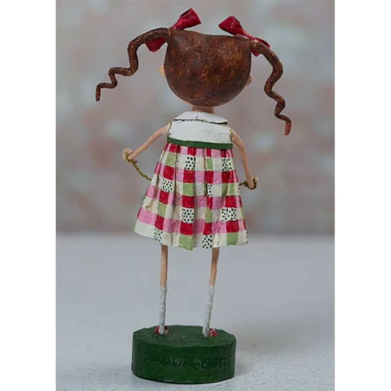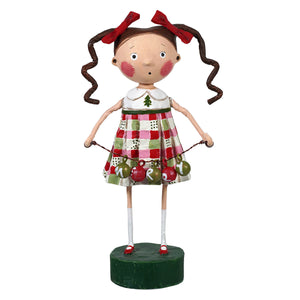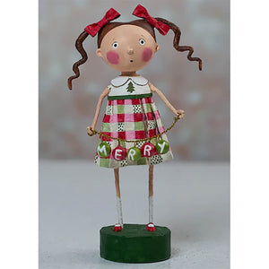 With pigtails tied up in bright red bows and holiday cheer in her heart, Merry Mary by Lori Mitchell is here to spread Christmas joy—literally! Dressed in a festive red and green plaid skirt and a white shirt proudly displaying a Christmas tree, she’s the picture of seasonal spirit. But the real star of the show? The string of red and green bauble ornaments she’s holding, carefully spelling out MERRY for all to see.