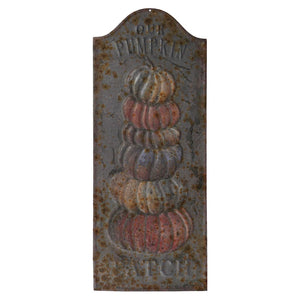 Standing at 18 inches tall, this captivating metal sign showcases a delightful stack of pumpkins, their colors gently faded and aged to evoke a nostalgic charm. Designed to resemble an antique sign found on an old farm, it brings a touch of rustic elegance to your seasonal decor. The intricate details and carefully crafted patina add character and authenticity to this timeless piece.