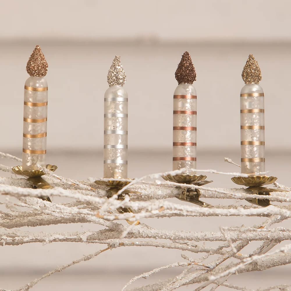 Illuminate your holiday spirit with the Metallic Striped Candle Ornaments Set by Bethany Lowe Designs!
