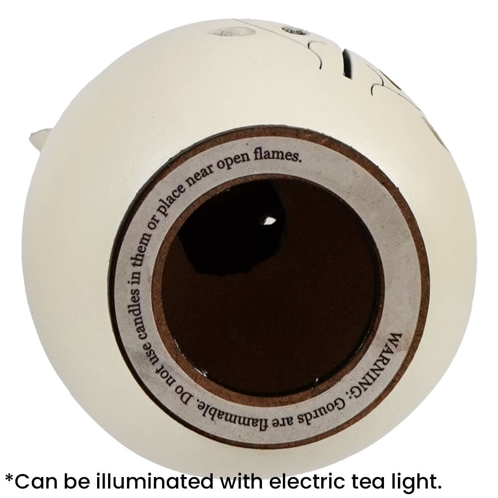 Its soft ivory surface is contrasted by crisp black floral cutouts, including a bold tulip on the front that doubles as a window for light. A hole at the base lets you add a battery-operated tea light (not included), which gently glows through the carved shapes like morning sun filtering through garden leaves. Just don’t reach for anything with an open flame, dried gourds and fire are not friends.